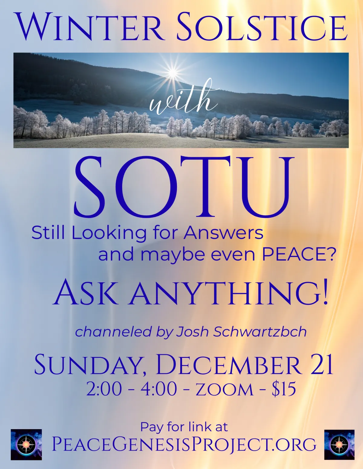 The following are excerpts from a live presentation with EZEKIEL in New York City, December 9, 2001. EZEKIEL, an aspect of SOTU, was channeled by Josh Schwartzbach. © 2001- 20214EJA Magical Journeys